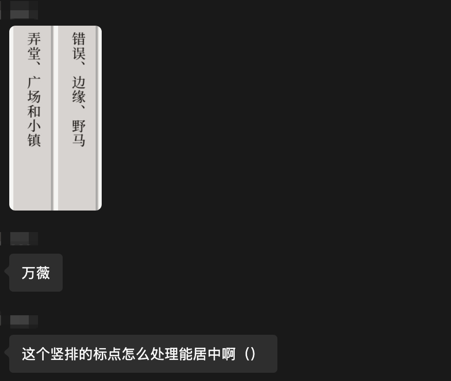 随后群友(我们就叫他阿强吧)发了一张截图,语气焦虑:“各位大佬,救命!设计师要把这个竖排文字做成古风网页,但他非说我的标点符号‘位置不对’,要我改成居中。但我怎么调都是偏右上的!”