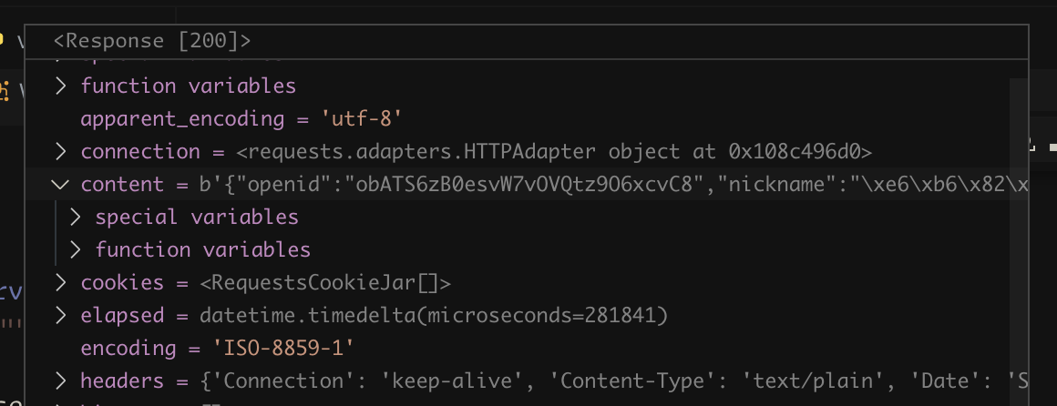 在这段代码中,直接拿了微信的返回值解析,会导致乱码: